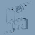 | Inštalácia: PDVT je zapojený do protiprúdu. Primárna strana je označená modrým bodom (napr.: produkt, chladič). Primárna strana je obklopená sekundárnym kanálom (napr. voda). (1) Kvapalina - kvapalina: inštalácia je možná v akomkoľvek smere, protiprúd je však účinnejší. (2) Výparník, (3) Kondenzátor. | |